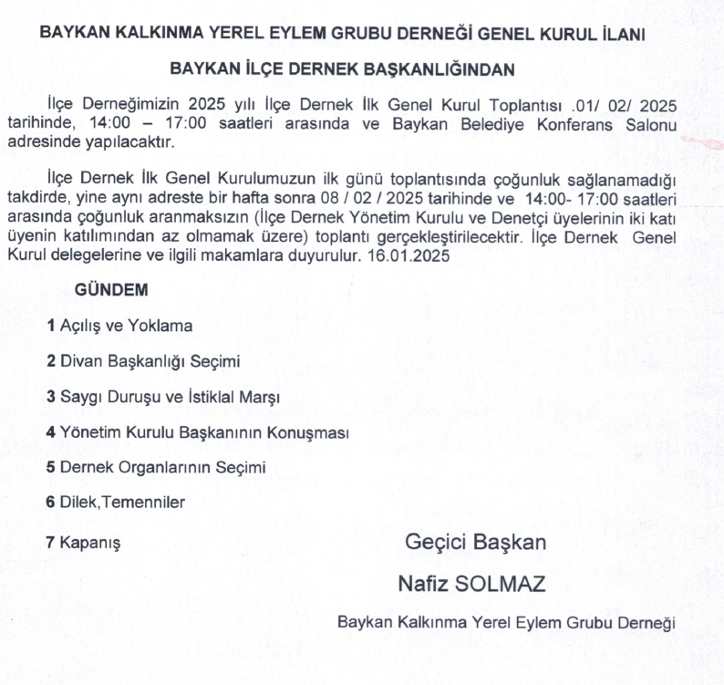 Baykan Kalkınma Yerel Eylem Grubu Derneği Genel Kurul İlanımız;